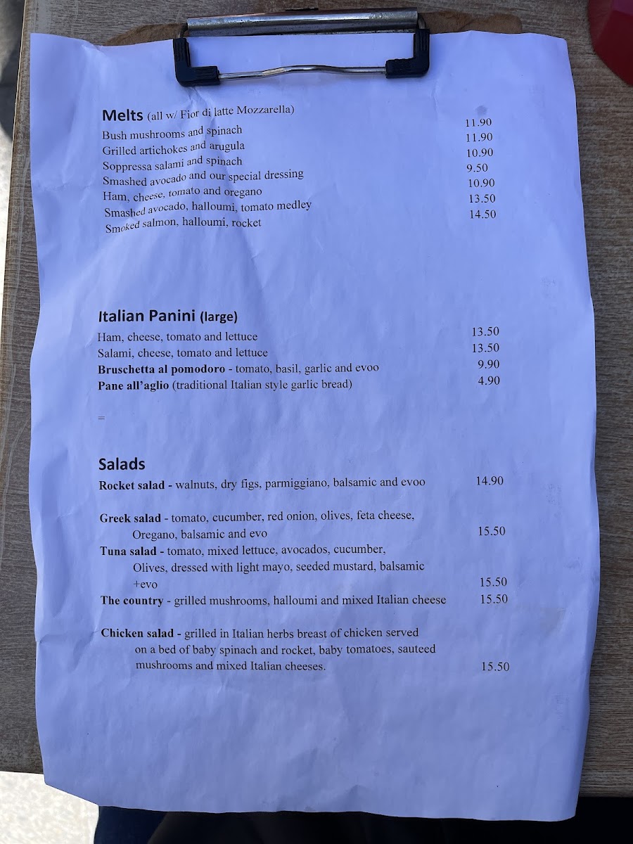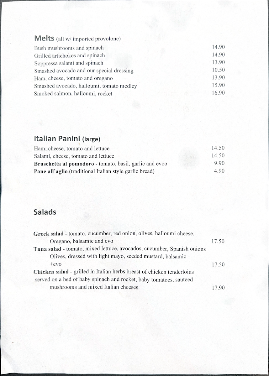 For lighter fare, the menu offers a variety of melts, including combinations like bush mushrooms and spinach, grilled artichokes and spinach, soppressa salami and spinach, smashed avocado with a special dressing, ham, cheese, tomato, and oregano, smashed avocado with halloumi and tomato medley, and smoked salmon with halloumi and rocket.